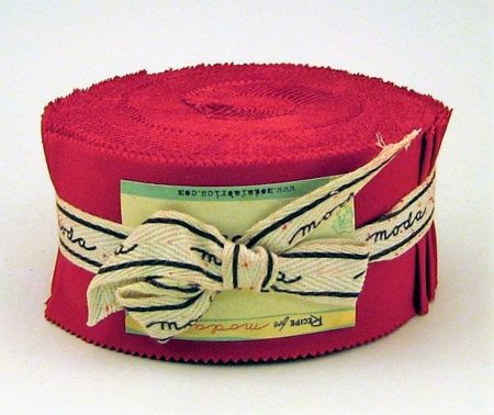 Bella Solids – Red Color Moda Jelly Roll…Part of Moda’s Gourmet Recipe for super quilt making….”Combine all jelly roll ingredients with your favorite line of Moda fabrics and create a quilt that is sure to be a recipe that everyone will want the secret to”. The other four color jelly rolls are also available in our store. These basic colors are your secret to great quilt making! This Jelly Roll contains forty 2 1/2″ x 45″ strips of fabric rolled up and tied in a cute ribbon. Fabric is all new, 100% premium Moda cotton.