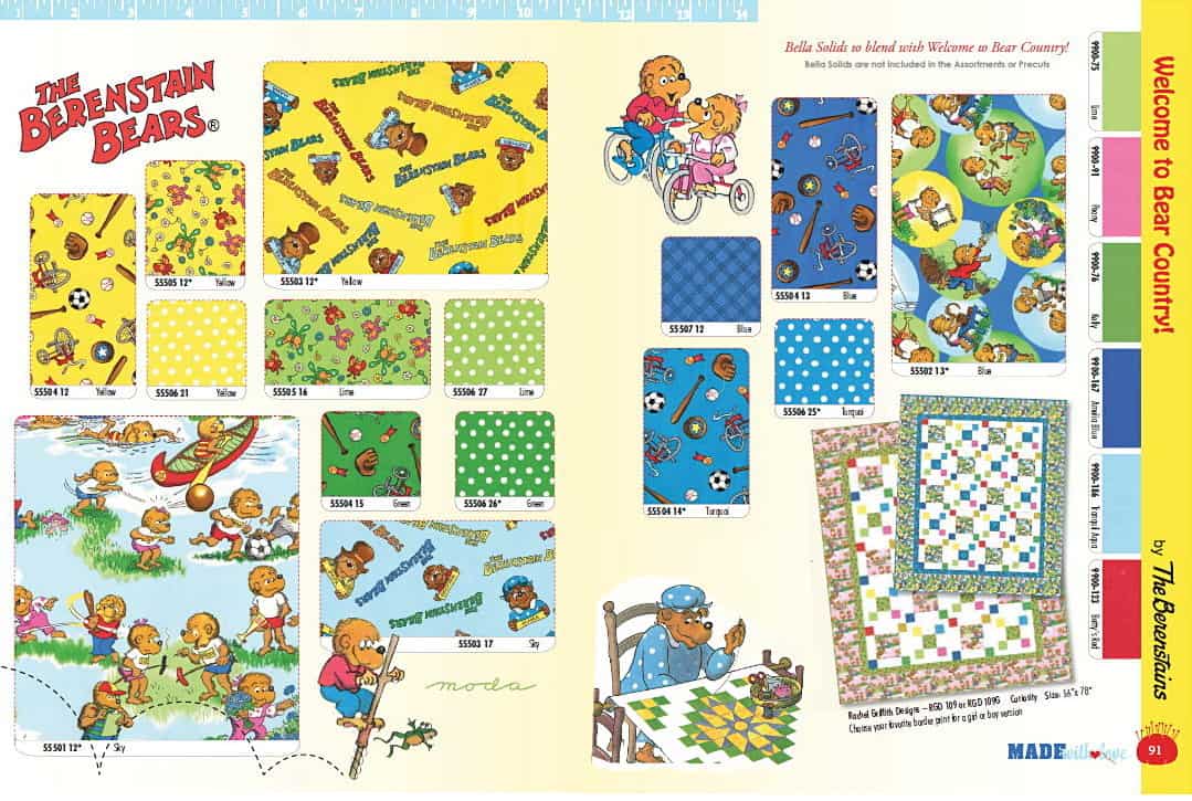 Welcome to Bear Country by Berenstain Bears for Moda fabrics. This 42 set contains all the fabrics this collection in 5″ charms / quilt squares. Fabric is all new, 100% premium quality Moda cotton. See photos of entire fabric collection above. More in this collection available in our store while supplies last. Use store search engine to find. Collection Description: Down a sunny dirt road deep in the heart of Bear Country sits a big tree house where the Berenstain Bears are enjoying some summer fun. Join Mama Bear, Papa Bear, Brother Bear and Sister Bear for sports, arts and crafts and other exciting outdoor activities! The Berenstain Bears books have been a family favorite for generations and with over 300 titles published worldwide since the early 1960’s, these iconic and loveable bears are ready to find a new home in your quilting and children’s craft projects.