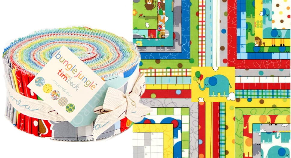 Bungle Jungle Moda Jelly Roll by Tim and Beck for Moda fabrics. This Jelly Roll contains forty 2 1/2″ x 45″ strips of fabric rolled up and tied in a cute ribbon. Fabric is all new, 100% premium Moda cotton. See photos of entire fabric collection above. More in this collection available in our store while supplies last. Use store search engine to find. Collection Description: Get crafty with a whole herd of cute critters. Don’t worry these pals won’t bite, they are ready to be snugly in your next quilt creation. Be inspired to let your imagination run wild with Bungle Jungle, the premier collection from Moda’s new design team, Tim and Beck.