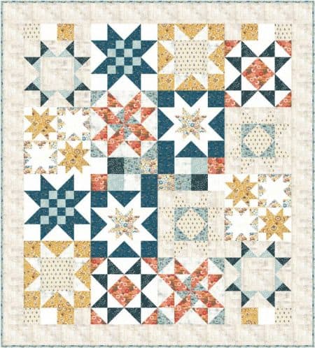 This Moda Quilt kit contains everything you need to make a 74″ x 82″ quilt top just as shown in the first picture, along with the fabric for binding, and the pattern. See 2nd photo of the fabric in this collection and in your kit.