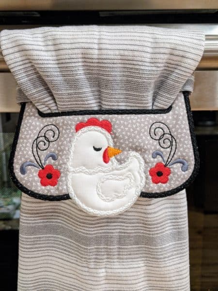 This fabric kit will make a set of two towel toppers just as shown in the picture (towels not included).    No fabric substitutions.  Towel wraps around a handle and pulls through the embroidered slot.   The embroidery design is not included but can be purchased at Designs by JuJu or clicking here:  ITH Chicken Wrap Around Towel Topper (designsbyjuju.com)
