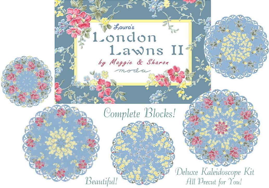 A kaleidoscope kit complete with all fabric precut! No tedious kaleidoscope layering or cutting necessary. Your quilt blocks are precut and ready to stitch! Each block measures approx. 8″ square when stitched and each block in the set will be uniquely different due to layering the fabric in exact repeats. No two will be the same. Shown are just a few of the endless possibilites! This kit contains 72 precut pieces that will produce 6 quilt blocks. Moda marbled lilac precut corners are included to complete your blocks. These blocks are rotary cut from 100% premium quality cotton in a smoke free shop. Also included is our exclusive Jelly Rolls 2 Go © Lace & Scalloped Edge template to make the lacy scalloped edges as shown above. BONUS: Included are easy illustrated instructions to complete the blocks. It is quick and easy, even for beginners! Extra tips included for dimensions to include these blocks in a King, Queen, Double, Twin or Baby Crib, wall hanging quilt as well as a Table Runner, Placemats or Patchwork Handbags & Totes. More items from this Collection available in our store while supplies last. Use store search engine to find.