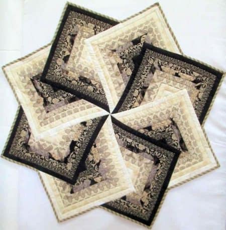 This quilt kit makes a beautiful table topper or wall quilt. Finished size is approx. 44″ x 44″. This kit contains the pattern and all the fabric that you need to make the quilt top. Batting, backing and binding not incl.