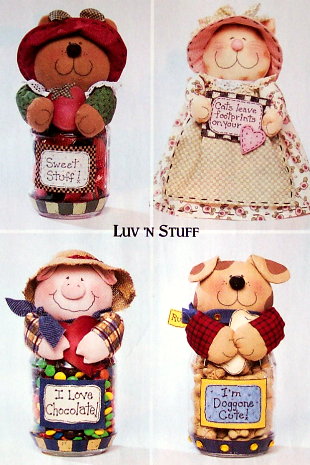 LUV ‘N STUFF Quilt Pattern Stash sweet treats for you or your favorite four-legged friend in these whimsically decorated jars. Pattern and easy instructions for cat, bear, dog and pig themed jar covers. sku ccb3986