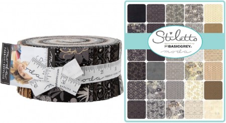 Stiletto Moda Jelly Roll – Jelly Roll by Basic Grey for Moda fabrics. This Jelly Roll contains forty 2 1/2″ x 45″ strips of fabric rolled up and tied in a cute ribbon. Fabric is all new, 100% premium Moda cotton. See photos of entire fabric collection above. More in this collection available in our store while supplies last. Use store search engine to find.