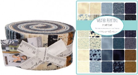 Weather Permitting – Jelly Roll by Janet Clare Moda fabrics. This Jelly Roll contains forty 2 1/2″ x 45″ strips of fabric rolled up and tied in a cute ribbon. Fabric is all new, 100% premium Moda cotton. See photos of entire fabric collection above. More in this collection available in our store while supplies last. Use store search engine to find.
