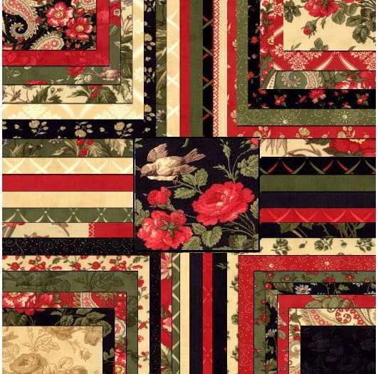 Wintergreen Quilt Kit by 3 Sisters for Moda fabrics. Finished quilt size is 67″ x 67″. Fabric and pattern comes packed in a cute Moda Tote Bag! See swatches of fabrics in this collection above.